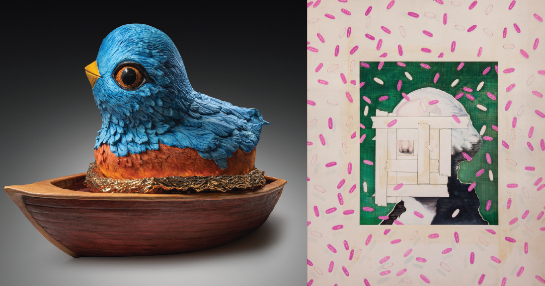 Kristen Cliffel, The Navigator, 2019, low fire clay, glaze, gold luster, wood, and resin, 2020.9.