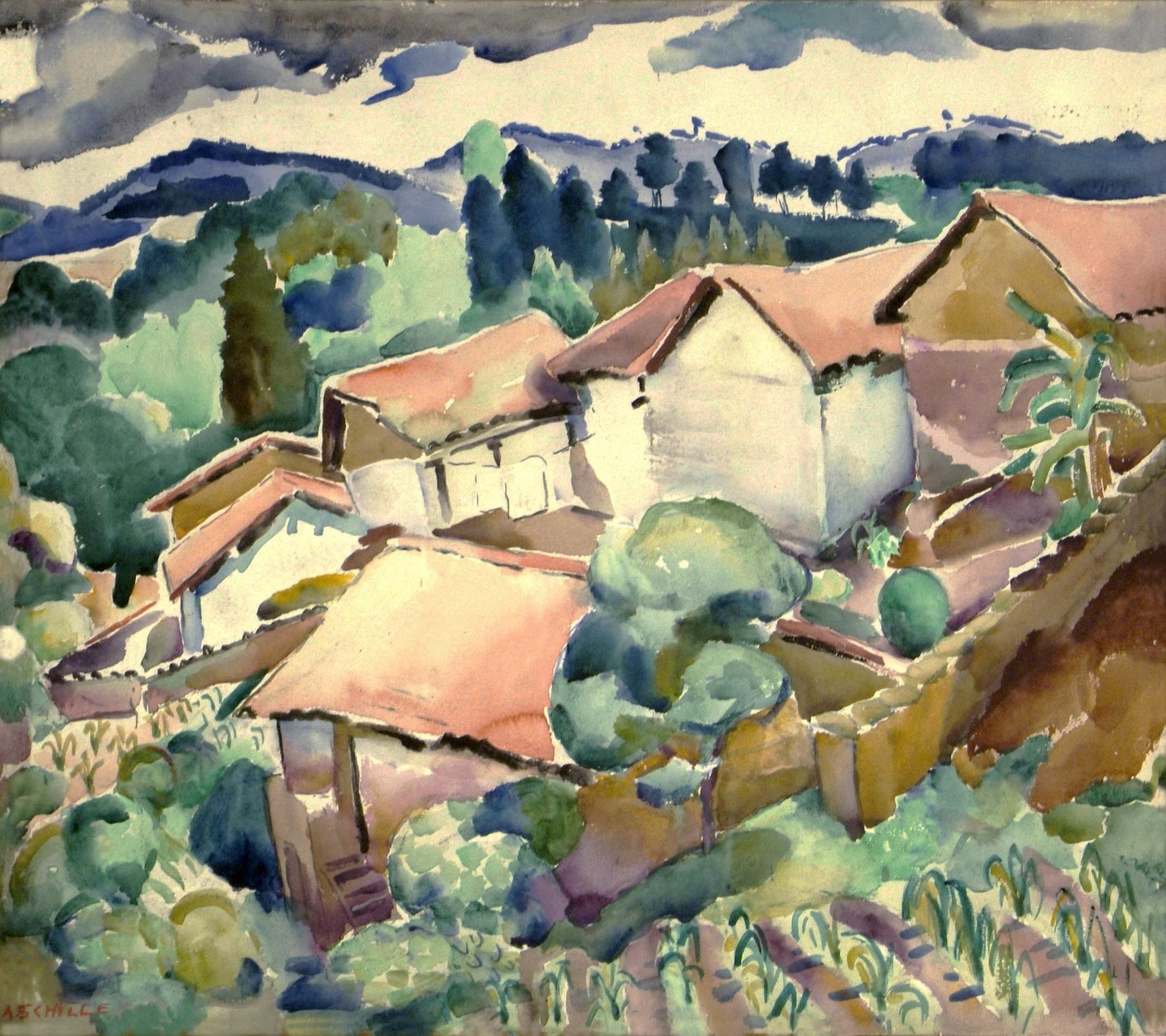 Guatemalan Rooftops demonstrates Schille's technique as one of the first American artists to use modernism in their work, and showcases her skill with watercolor as well as her travels, which women were discouraged from.