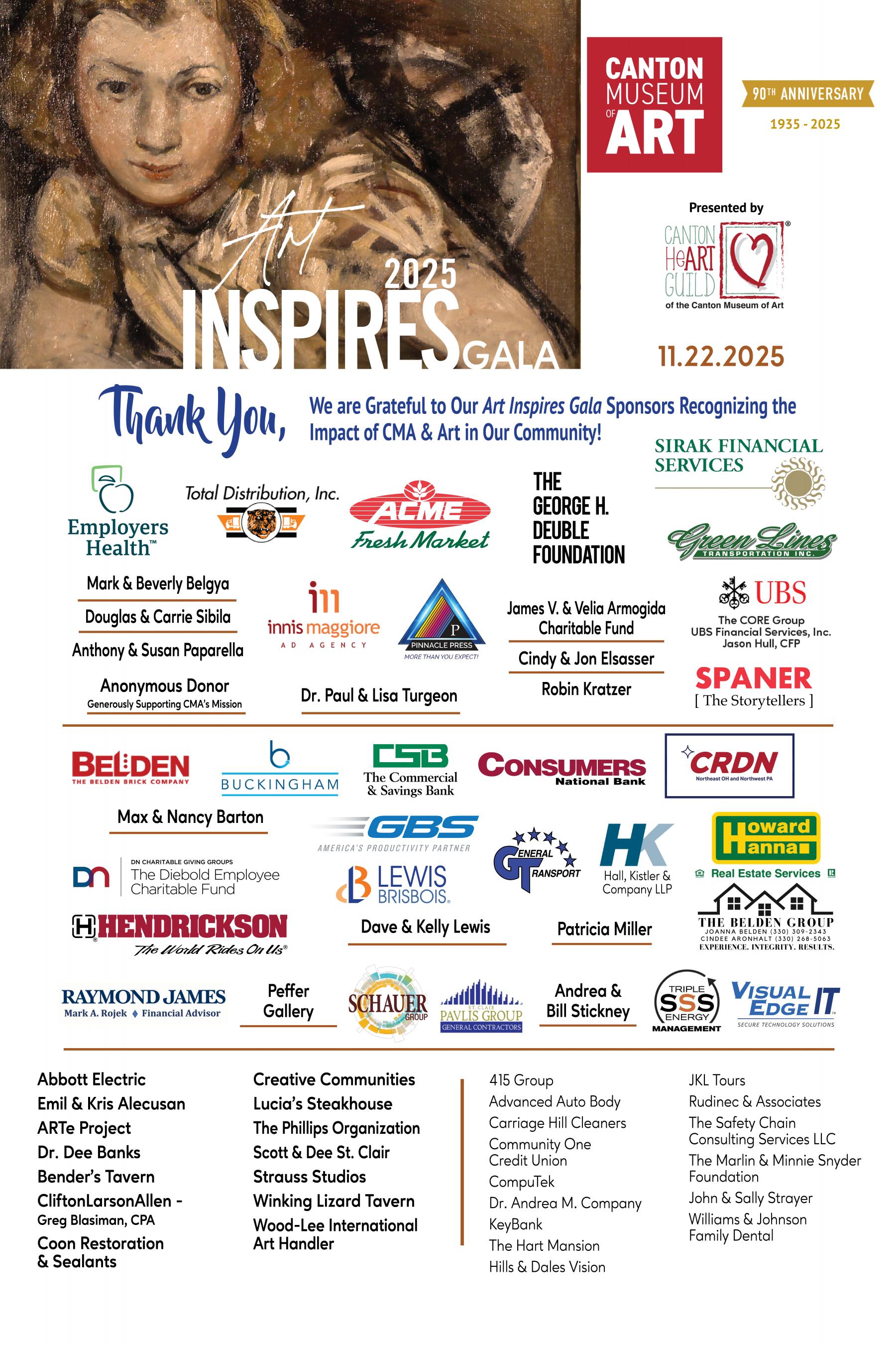 Our 2025 Art Inspires Gala promises a delicious mix of art, food, and drink; curated auction items; live music and a special dance performance from Canton Ballet; plus immersive experiences that connect you with creativity and inspiration.