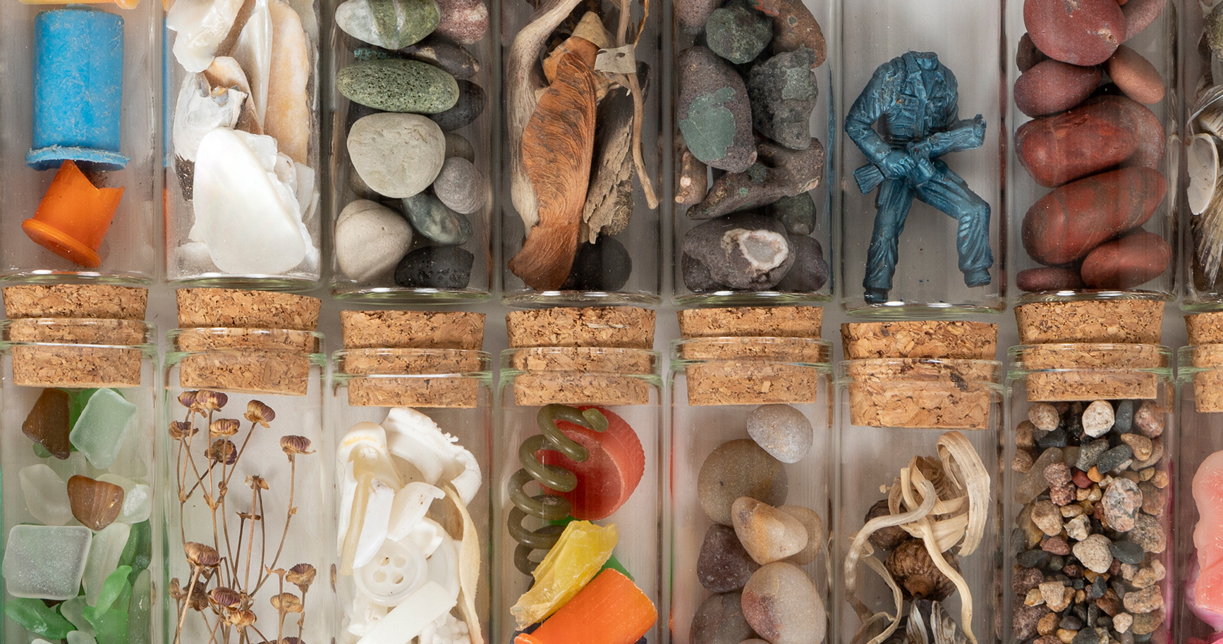 Geo Rutherford’s work explores notions of invasiveness, impermanence, and the unseen in relation to the Great Lakes. The transparent waters are a deceptive indicator of the health of the ecosystems below the surface. With climate change, invasive species, and polluted waters, the lakes are quickly devolving into a water desert at the heart of North America. She collects various specimens the lake has turned over to the sandy perimeter from mother nature’s pocket change to articles of the Anthropocene. Much of this evidence tells a deeper truth as to what is going on at the heart of Great Lake’s waters, such as the sharp white shells of zebra and quagga mussels, found indiscriminately amongst the lake detritus. Through lithography, block printing, screen printing, and etching, she creates a bounty of material to cut up and collage. She constantly repurposes prints, mixing media and experimenting with results that twist, squirm, pucker, tuck and multiply.
